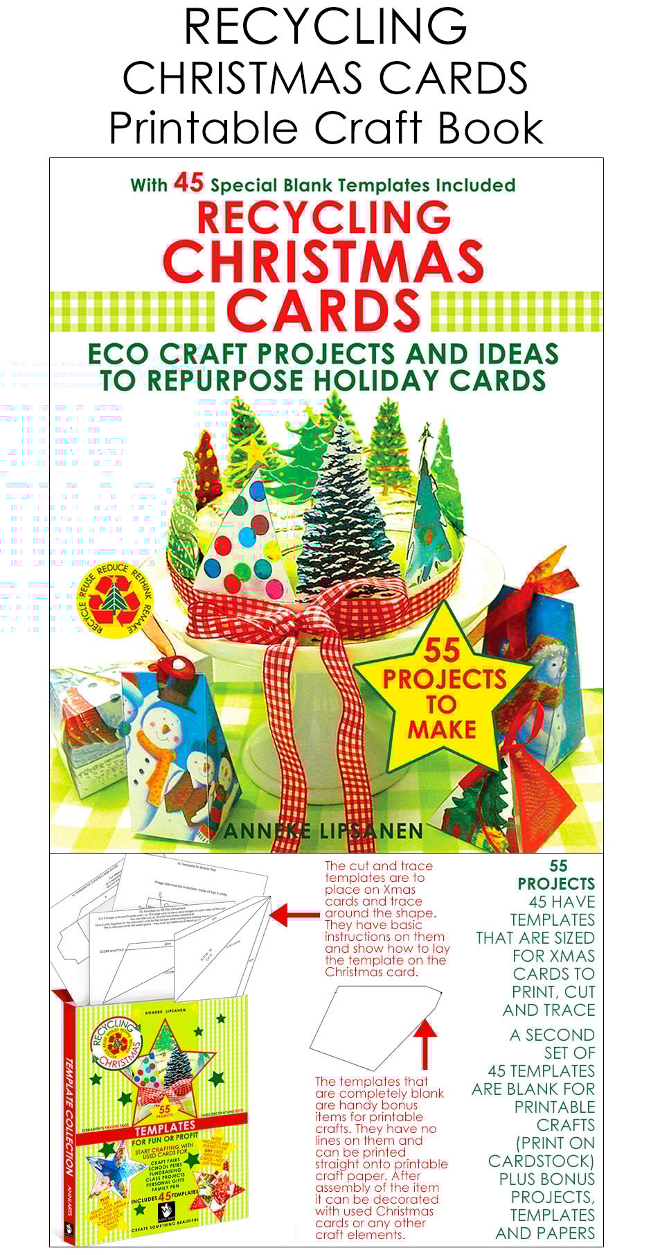 This book and template collections are full of eco craft projects and ideas to re purpose Christmas, Holiday and other greeting cards. The PDF includes lavish project photos and instructions for the crafts.