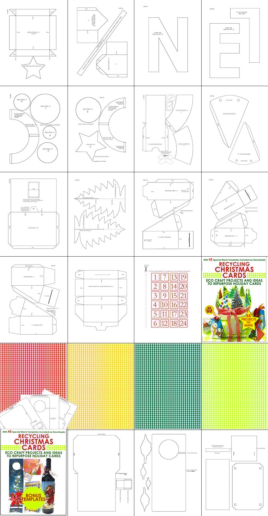 The extra set of the 45 craft templates are entirely blank with no lines on them, so that they are suitable for regular print crafts on patterned or solid colored papers! Print the blank templates onto printable paper. Make the item. Decorate with used Christmas card details or other elements.