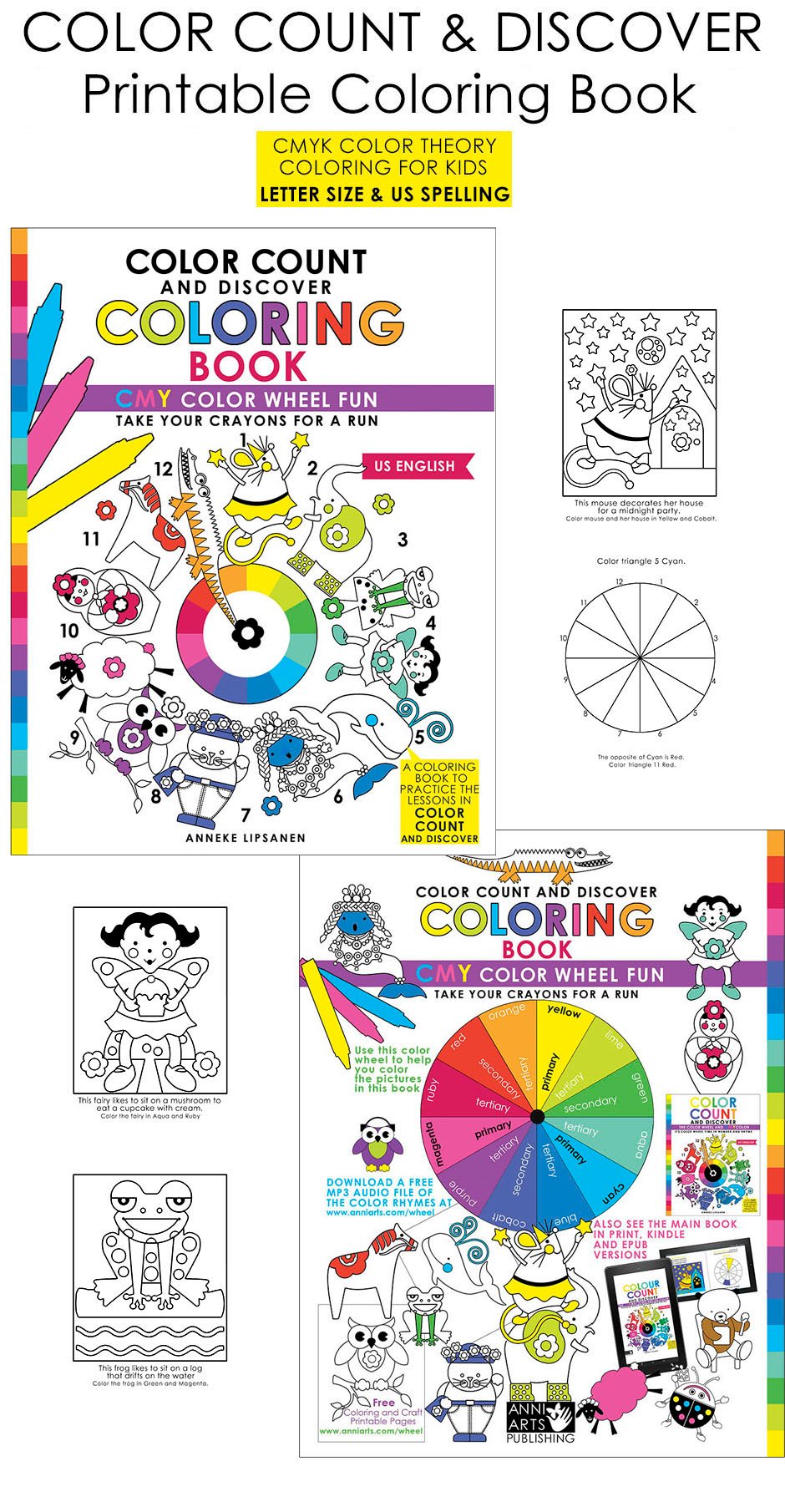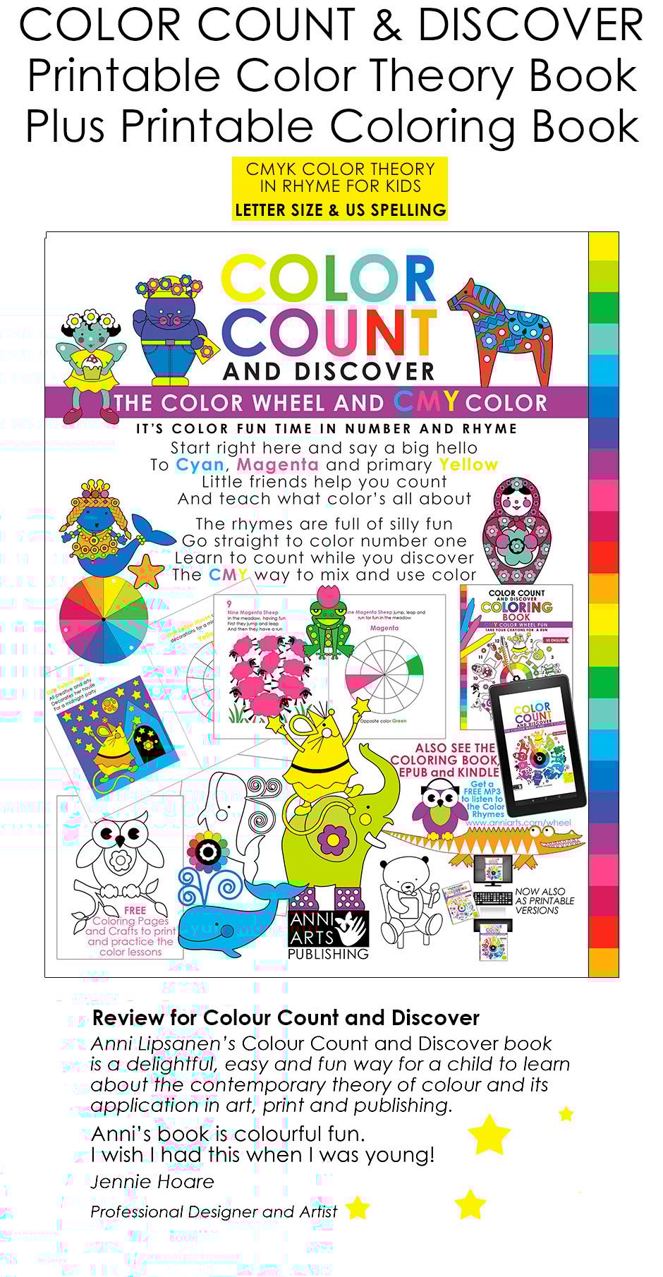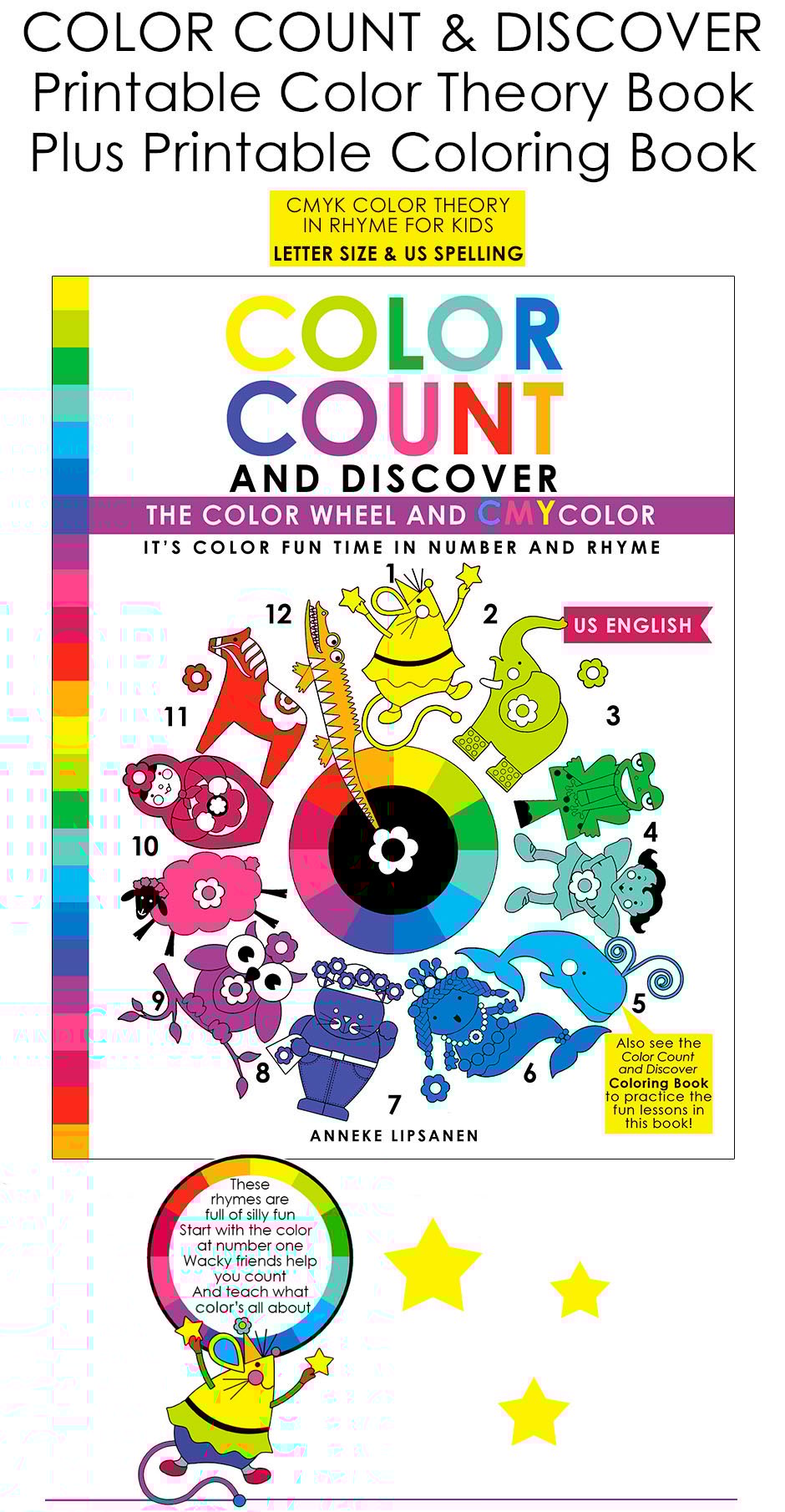 The CMY color system - with Cyan Magenta and Yellow as primary colors - is taught in fun color lessons in the form of silly counting rhymes and bold full-color illustrations. There is a matching coloring book too, as well as a free coloring and craft set.